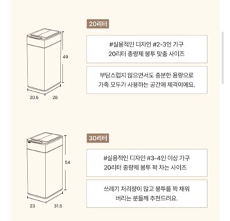 - 큰 용량 모델(20L, 30L)은 부피가 커서 좁은 공간에서는 자리 잡기가 어렵습니다.