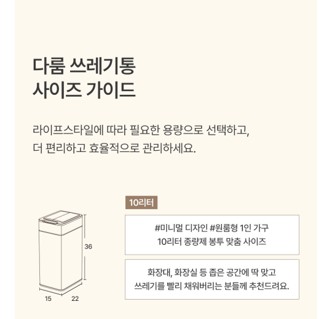 다룸 쓰레기통은 10리터, 20리터, 30리터 등 다양한 용량으로 출시돼 있어요. 1~2인 가구나 공간이 좁은 곳에는 10L가 부담 없고 적당합니다. 3~4인 가족이나 음식물 쓰레기가 많은 집은 20L 또는 30L를 선택하는 게 좋아요. 큰 용량일수록 자주 비우지 않아도 돼서 편리하답니다.
